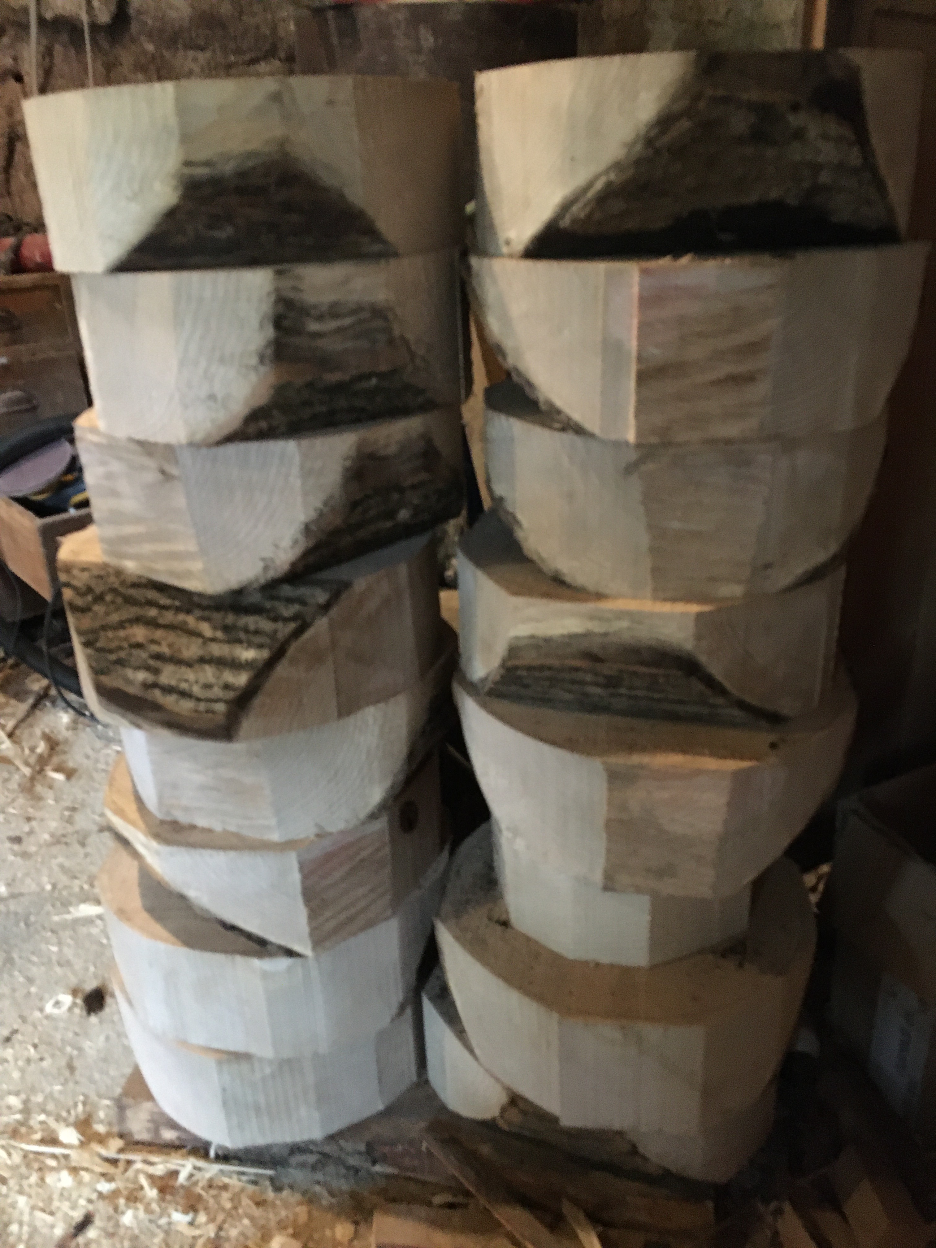 Na sliki je lepo prikazano, kako izgledajo surovci, razvidna je tudi smer rasti lesa – vidi se, kje je lubje, iz tega pa je tudi razvidno, v kateri smeri je drevo rastlo. Marsikdo bi si mislil, da se skledo naredi s čela, torej da dolžina odrezanega koluta predstavlja globino sklede in premer debla premer sklede, vendar je tovrstno delo le izjema in ne pravilo. Dolžina odrezanega koluta naj bo enaka debelini debla v smeri, v kateri ga nameravamo razpoloviti. Nato z motorno žago vzdolžno prerežemo kolut tik ob srcu drevesa in še enkrat vzporedno da dobimo željeno globino sklede. Dobljenemu določimo sredino in zarišemo krog, ki ga potem obžagamo kar se da uravnoteženo, lahko okroglo ali osemkotno, s tračno žago ali z motorno žago, v kolikor smo z njo dovolj spretni.