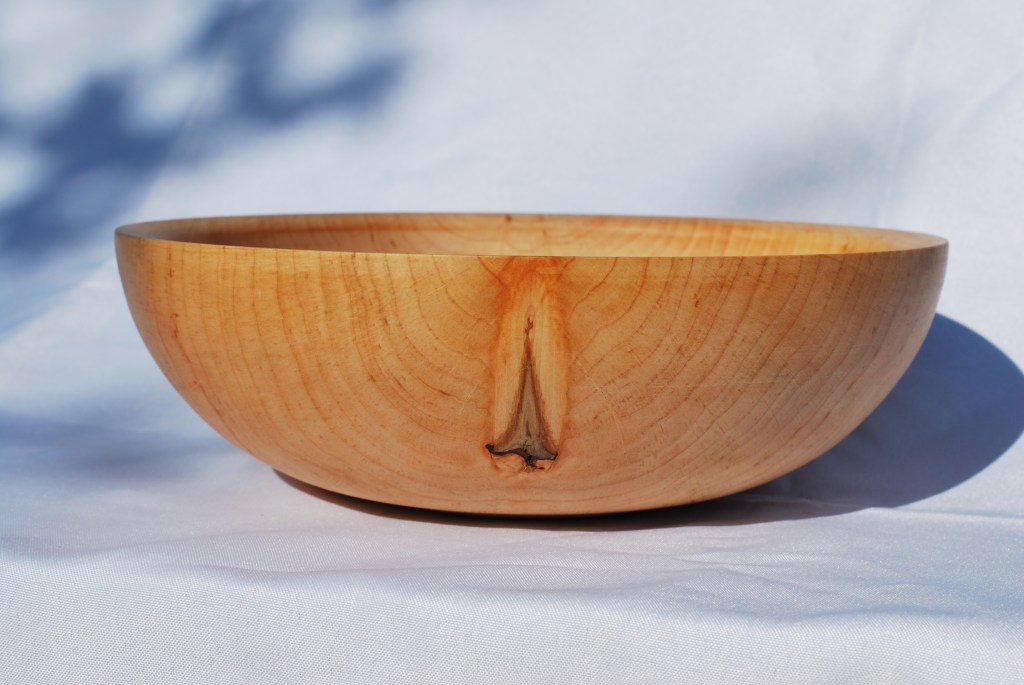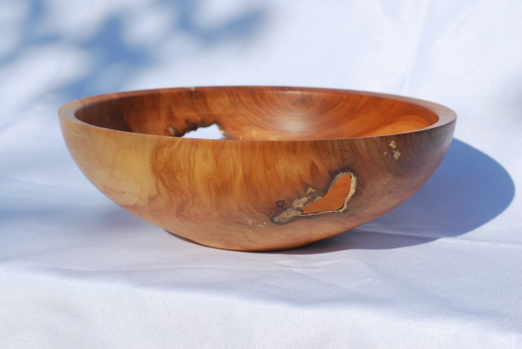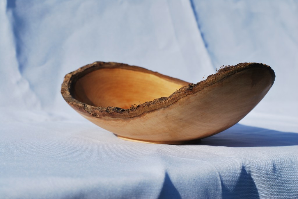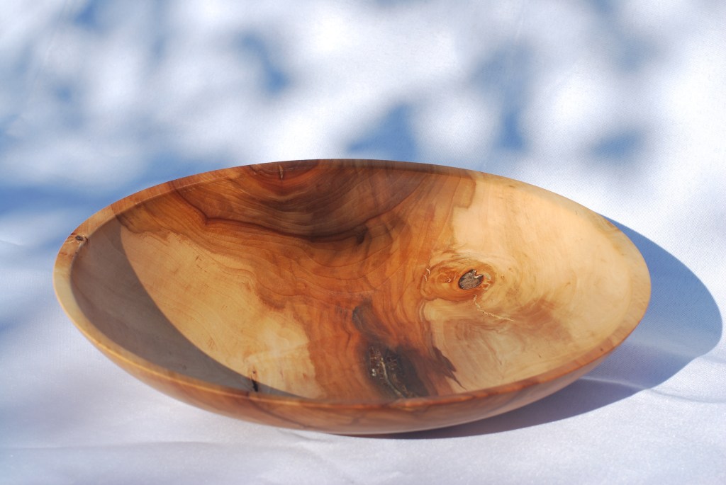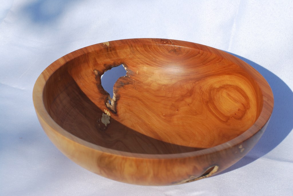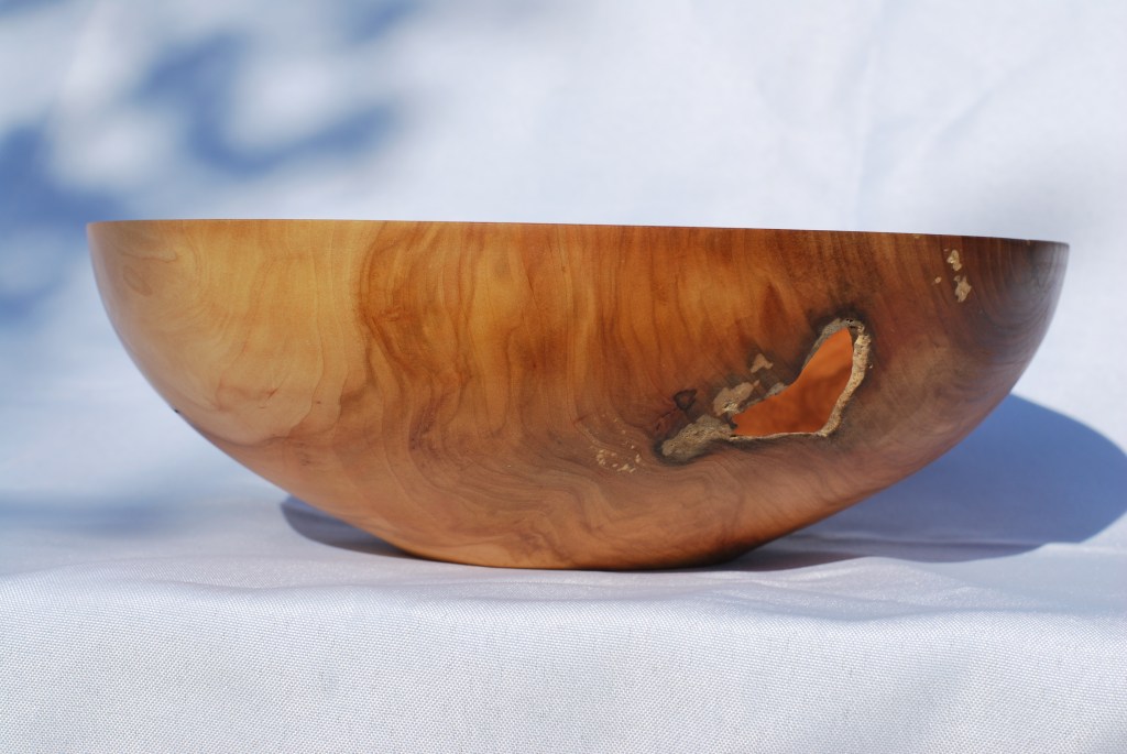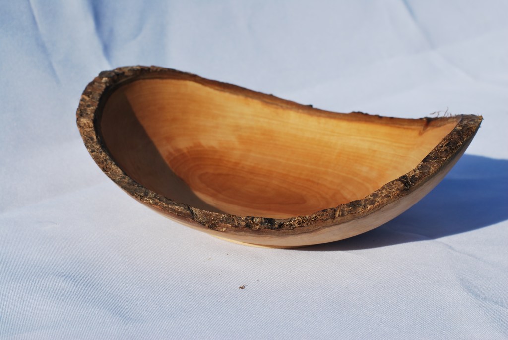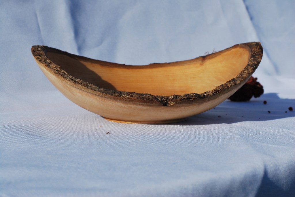Skleda je izdelana iz stare jablane, ki je zaključila svoj življenjski cikel. Luknji, ki krasita skledo, sta posledica trohnenja debla.